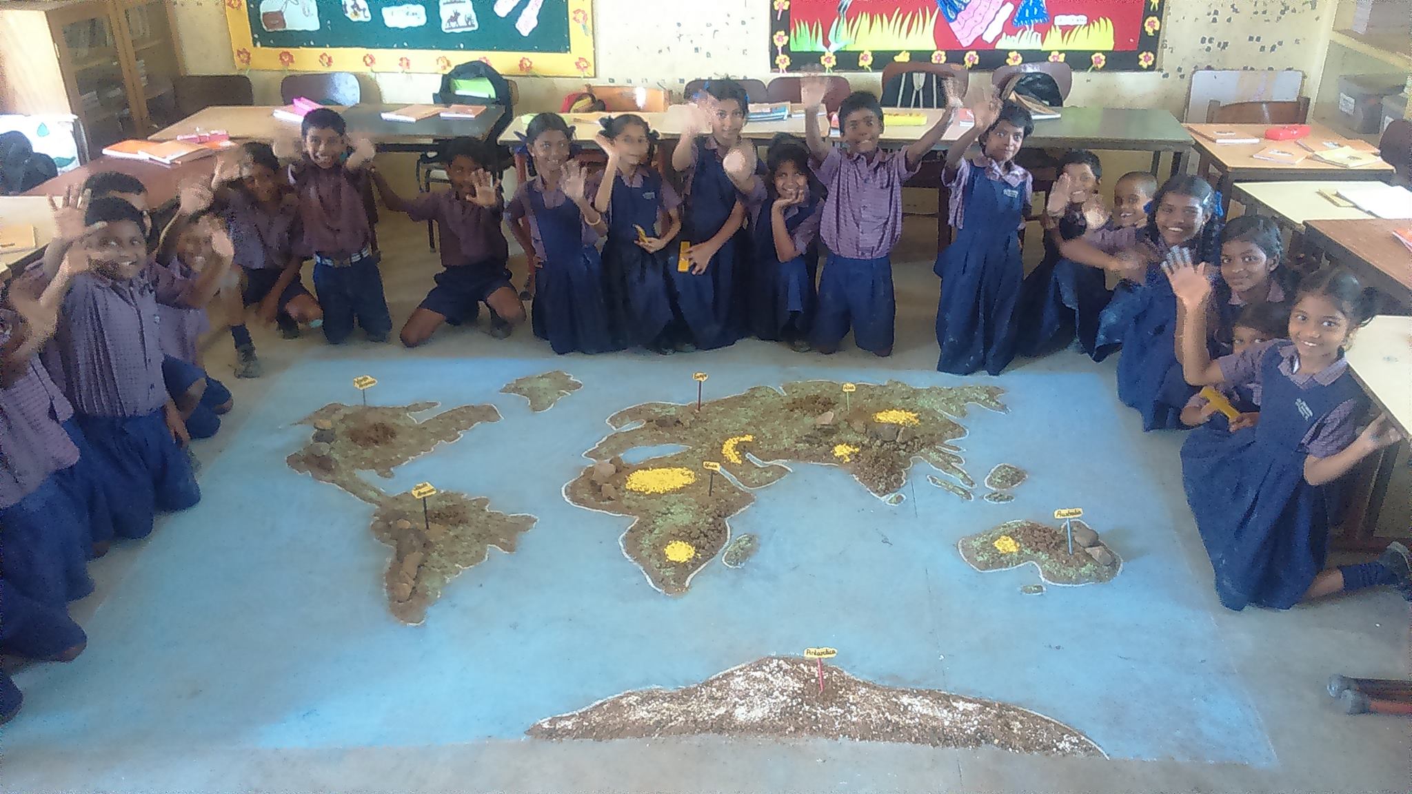 Class 3 has created a world map on their classroom floor with the help of sand, stones and colour powder. Sometimes cement floors are better than hi-tech smart boards for learning!